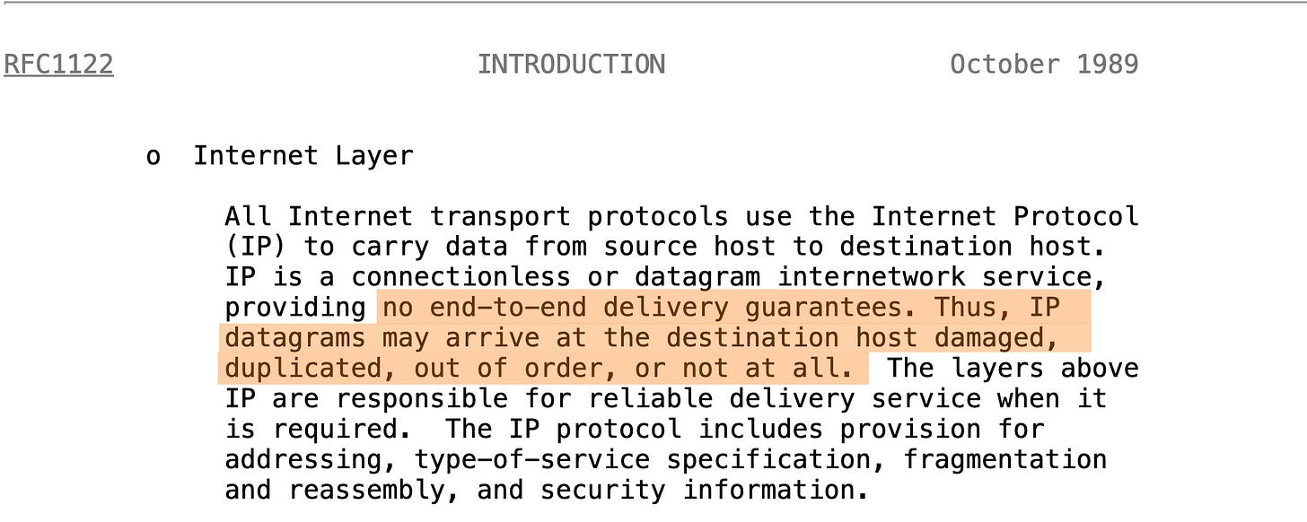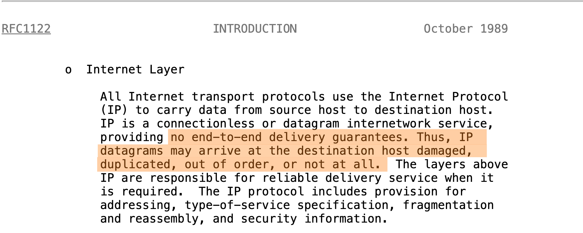 This demonstrates that the Internet Protocol in the protocol suite is inherently unreliable. Therefore, we must add reliability on at higher layers.