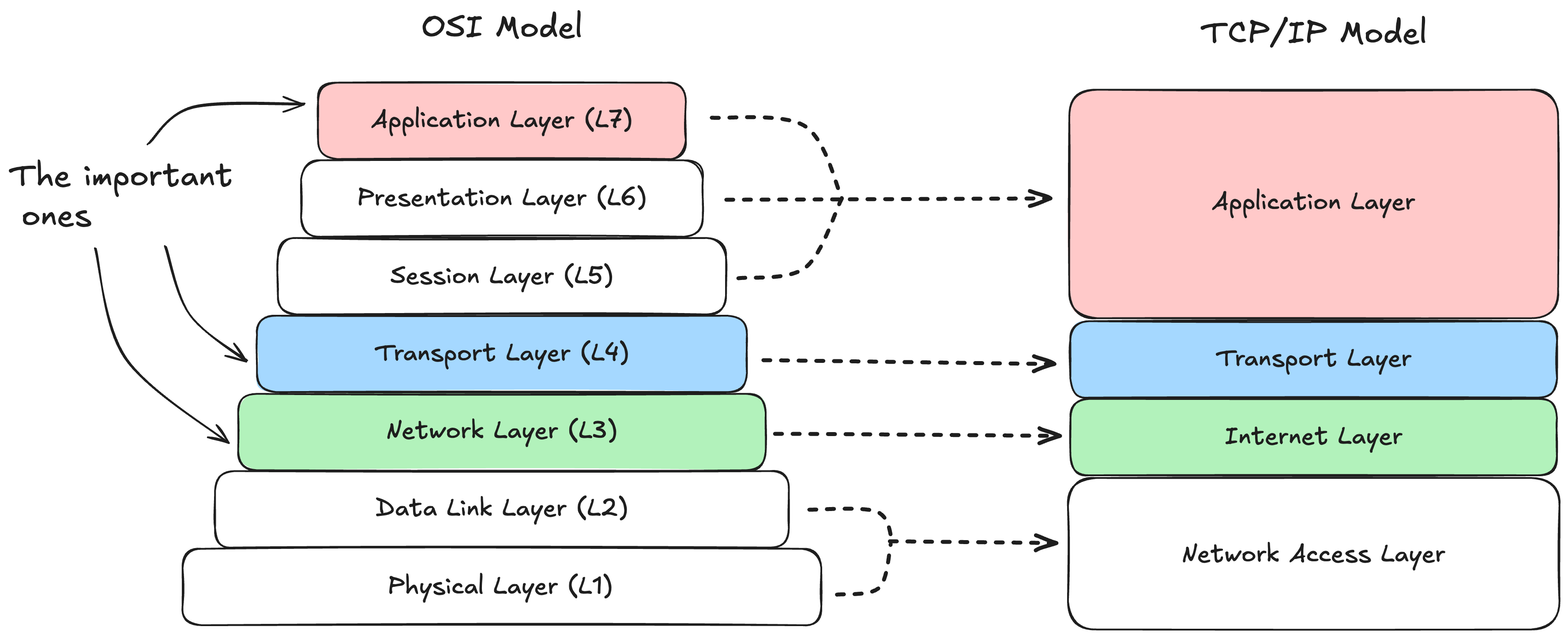 Note: While the internet is more aligned with the TCP/IP model, in casual discussion people still OSI numbering. For example: you’ll hear about L4/L7 load balancers, which live at Layer 4 or Layer 7 of the OSI model.