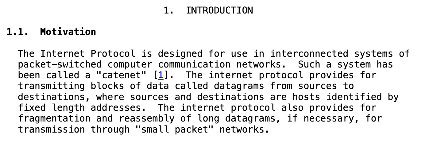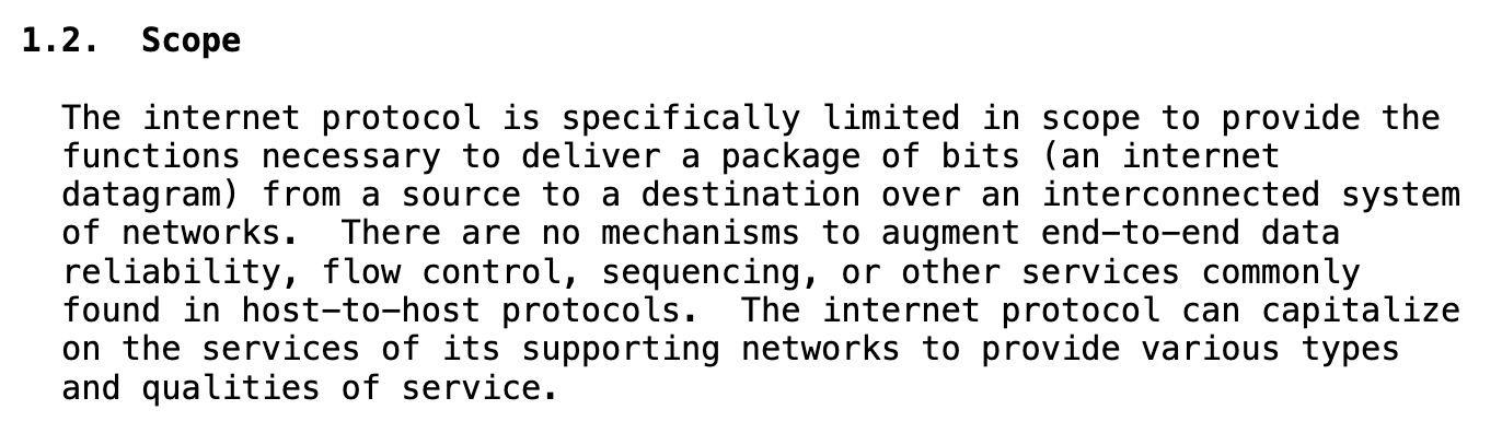 Once we know the problems, it is generally a good idea to define the scope: what should the Internet Protocol solve and what it should not? Look at the following section from RFC 791: