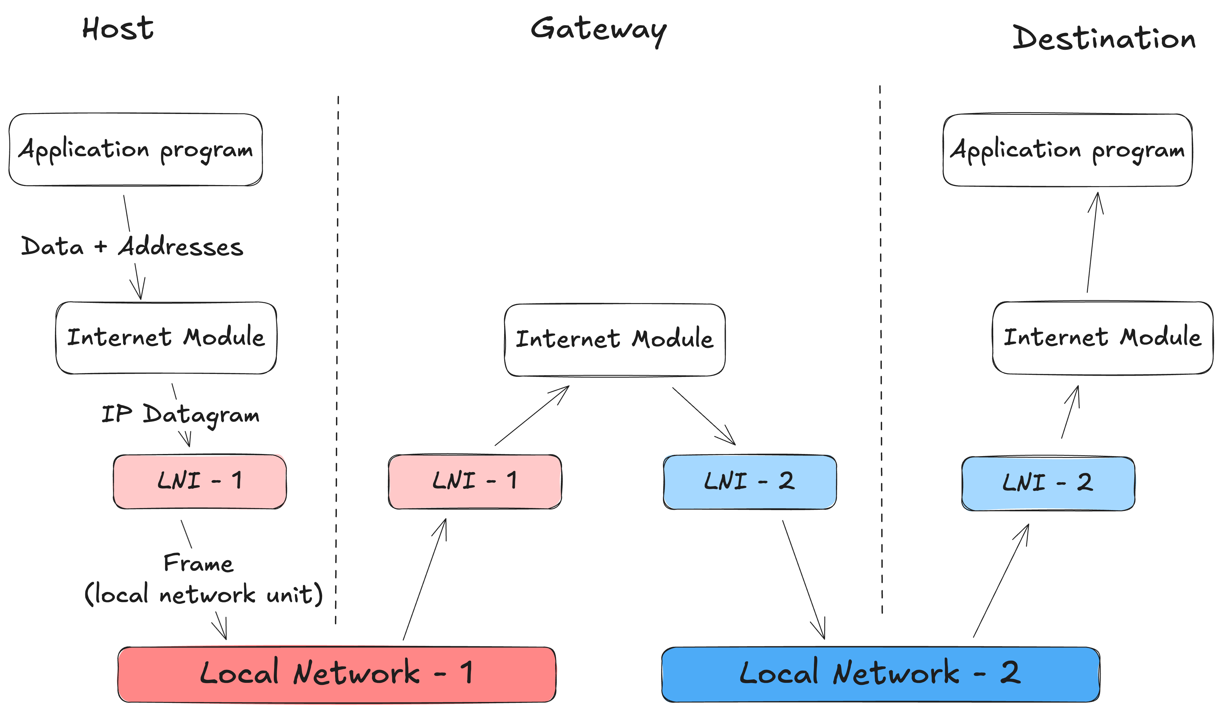 This unit is delivered to the next machine. If the destination is on the same network, it’s the final host. If not, it usually goes through a gateway (what we now call a router) - a machine whose job is to forward datagram toward other networks.