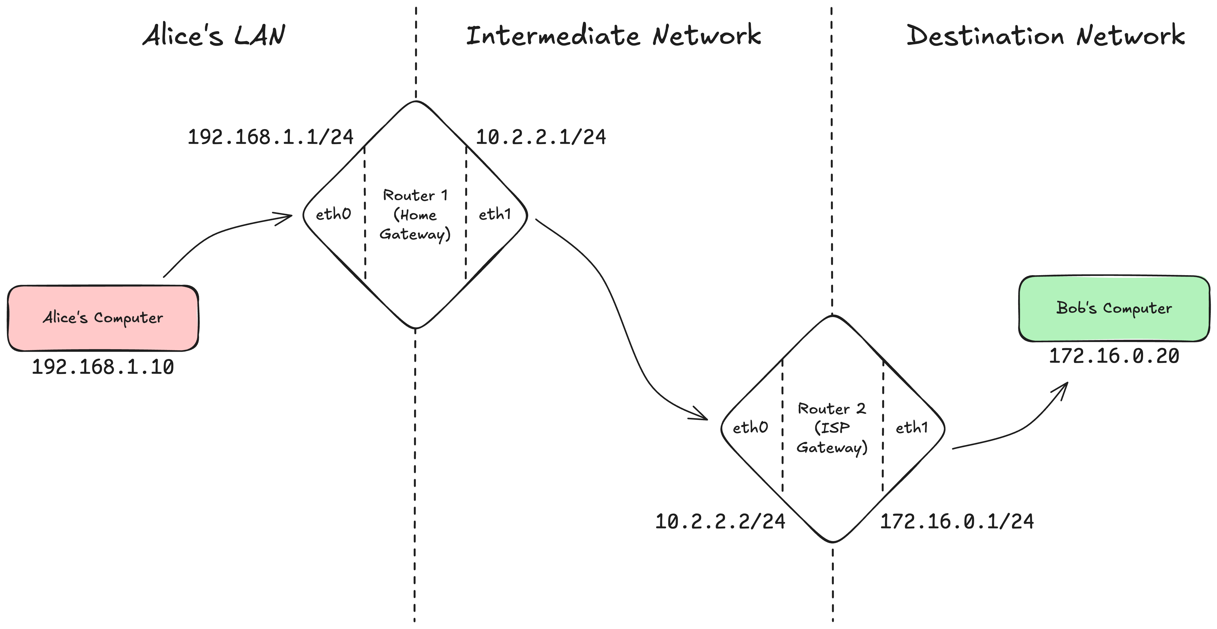 0.0.0.0/0 203.0.113.1 eth2 (default route to ISP)10.1.1.0/24→ any address starting with10.1.1.*is directly connected, so send it outeth0.10.2.2.0/24→ any address starting with10.2.2.*is directly connected, so send it outeth1.10.3.3.0/16→ any address starting with10.3.*.*is not directly reachable, so forward it to the next hop10.2.2.2viaeth1.0.0.0.0/0→ the default route: anything else goes to the ISP at203.0.113.1.