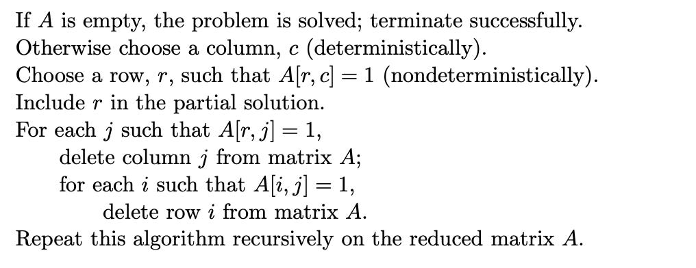 Otherwise, choose a column, c → any column will do, though a smart heuristic (like picking the one with the fewest 1s) makes things faster.