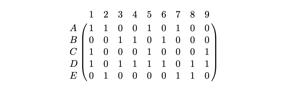 This is a generalised problem and many problems can be reduced to the Exact Cover Problem including Sudoku. We can imagine the columns to be the constraints, where each constraint should be satisfied exactly once. We can imagine the rows as the decision space, where we can take some rows to form our solution. This is discussed in-depth when we convert Sudoku to Exact Cover.