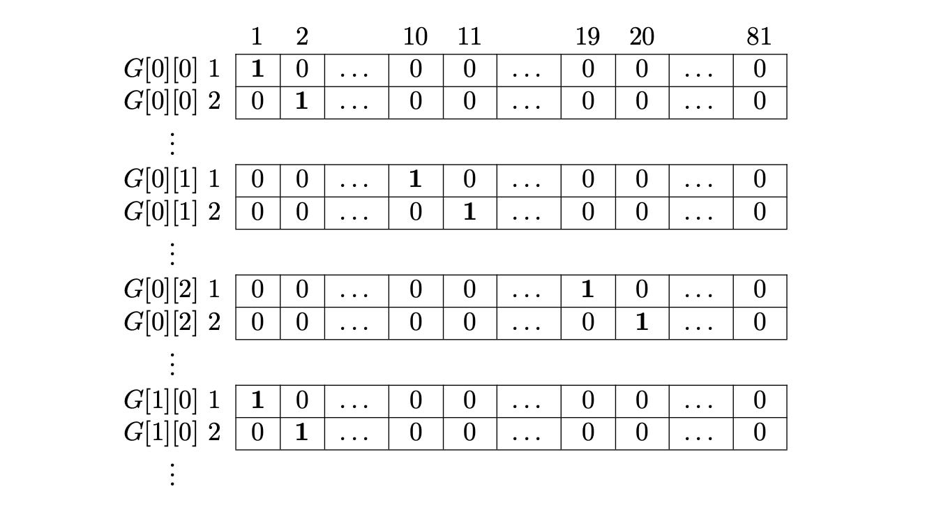 If that’s true, then G[1][0] cannot also contain 1 - that corresponds to row 82 in M. Similarly, G[2][0], G[3][0], …, G[8][0] also cannot contain 1, which correspond to rows 163, 244, and so on.