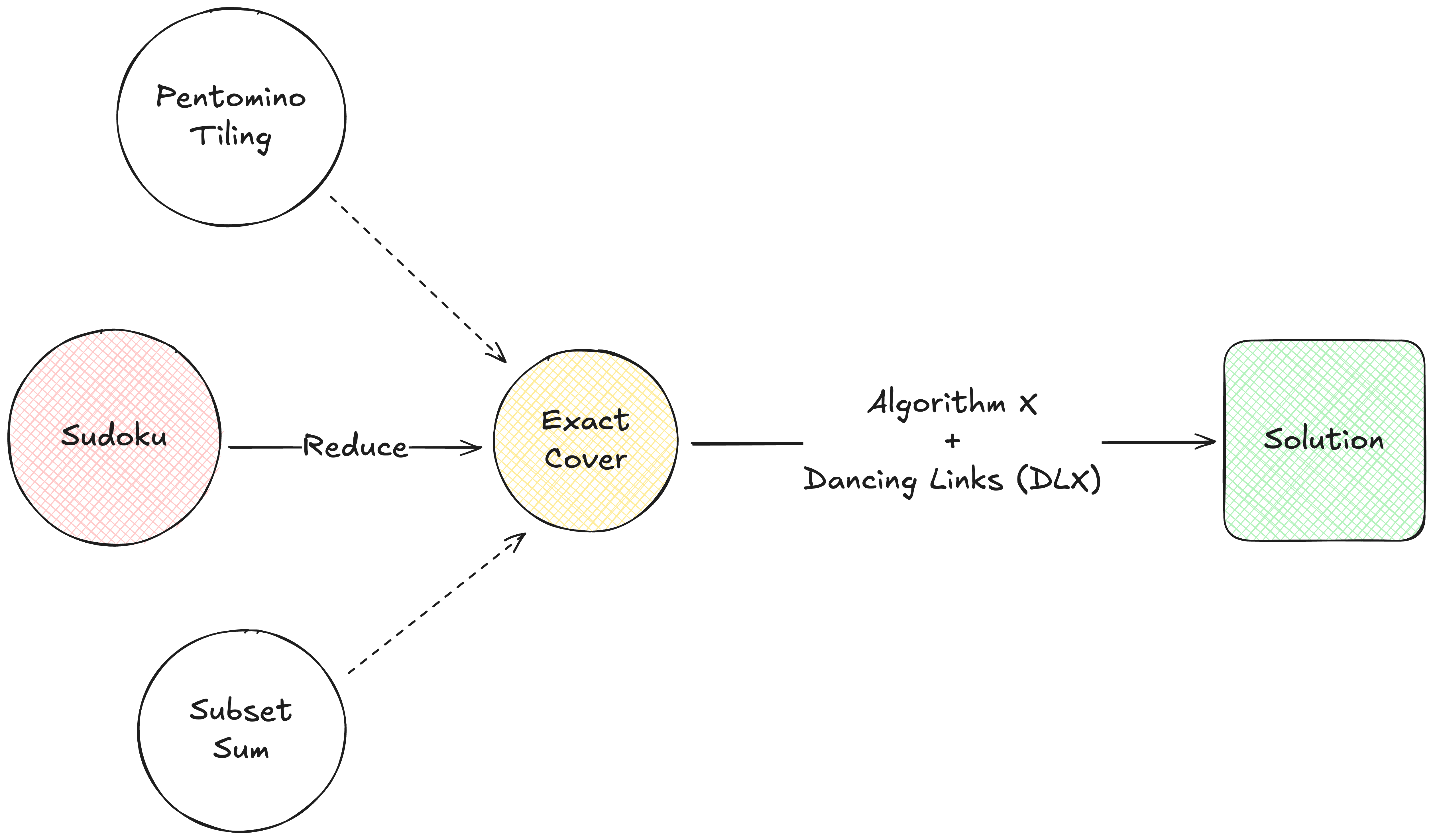 Starting from the rules of Sudoku, we reduced it to an Exact Cover problem, implemented Knuth’s elegant algorithm, and watched the puzzle solve itself.